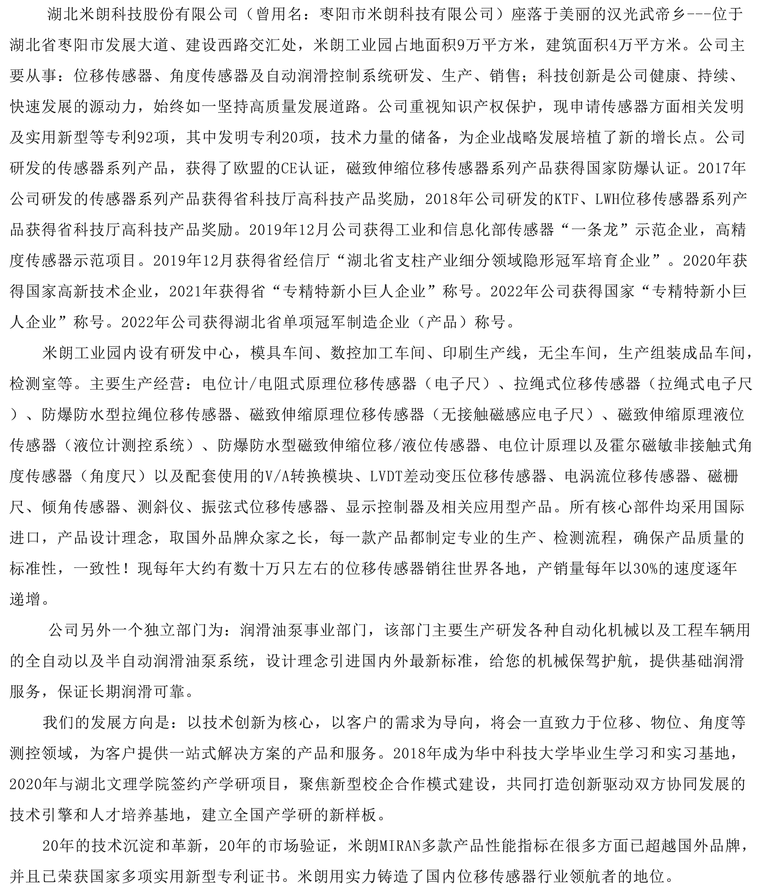 湖北米朗科技股份有限公司(曾用名:枣阳����� �������Ƴ������������ �������Ƴ������������ �������Ƴ������������ �������Ƴ�������市米朗科技有限公司)座落于美丽的汉光武����� �������Ƴ������������ �������Ƴ����������� �������Ƴ����������� �������Ƴ�������帝乡---位于湖北省枣阳市发展大道、����� �������Ƴ������������ �������Ƴ����������� �������Ƴ����������� �������Ƴ������建设西路交汇处,米朗工业园占地面9万平方米,建筑面4万平方米。公司主要从事:位移传感器����� �������Ƴ������������ �������Ƴ������������ �������Ƴ������������ �������Ƴ�������、角度传感器及自动润滑控制系统研发、生产����� �������Ƴ������������ �������Ƴ������������ �������Ƴ������������ �������Ƴ�������、销售;科技**是公司健康����� �������Ƴ����������� �������Ƴ����������� �������Ƴ������������ �������Ƴ�������、持续、快速发展的源动力,始终如一����� �������Ƴ������������ �������Ƴ������������ �������Ƴ������������ �������Ƴ�������坚持高质量发展道路。公司重视知识产权保����� �������Ƴ������������ �������Ƴ������������ �������Ƴ������������ �������Ƴ������护,现申请传感器方面相关发明及实用新型等**92项,其中发明**20项,����� �������Ƴ������������ �������Ƴ������������ �������Ƴ������������ �������Ƴ�������技术力量的储备,为企业战略����� �������Ƴ������������ �������Ƴ������������ �������Ƴ������������ �������Ƴ�������发展培植了新的增长点。公司研发的传感器系列产品,获得了欧盟����� �������Ƴ����������� �������Ƴ������������ �������Ƴ������������ �������Ƴ�������的CE认证,磁致伸缩位移传感器系列产品获得国家防爆认证。2017年����� �������Ƴ������������ �������Ƴ������������ �������Ƴ������������ �������Ƴ�������公司研发的传感器系列产品获得省科技厅高����� �������Ƴ����������� �������Ƴ������������ �������Ƴ������������ �������Ƴ�������科技产品奖励,2018年公司研发的KTF、LWH位移传����� �������Ƴ������������ �������Ƴ������������ �������Ƴ������������ �������Ƴ�������感器系列产品获得省科技厅高科技产品奖励。2019年12月公司获得工业和信息化部传感器一条龙”示范企业,高精度����� �������Ƴ������������ �������Ƴ������������ �������Ƴ������������ �������Ƴ�������传感器示范项目2019年12月获得省经信厅“湖北省柱产业细分领域隐形**培育企业”。2020年获得国家新技术企业,2021年获得省“专精特新小巨人企业”称号。2022年公司获得国家����� �������Ƴ������������ �������Ƴ������������ �������Ƴ������������ �������Ƴ�������“专精特新小巨人企业”称号。2022年公司获得湖北省单项**制造企业����� �������Ƴ����������� �������Ƴ������������ �������Ƴ������������ �������Ƴ�������(产品)称号