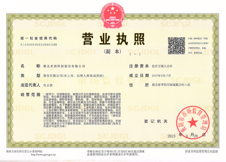 湖北米朗科技股份有限公司(曾用名:枣����� �������Ƴ������������ �������Ƴ������������ �������Ƴ������������ �������Ƴ�������阳市米朗科技有限公司)座落于美丽的����� �������Ƴ������������ �������Ƴ������������ �������Ƴ������������ �������Ƴ�������汉光武帝乡---位于湖北省枣阳市发展大道、建设西路交����� �������Ƴ������������ �������Ƴ����������� �������Ƴ������������ �������Ƴ�������汇处,米朗工业园占地面积9万平方米,建筑面积4万平方米。公司主要从事:位移传����� �������Ƴ������������ �������Ƴ������������ �������Ƴ������������ �������Ƴ������感器、角度传感器及自动润滑控制系统研发����� �������Ƴ����������� �������Ƴ����������� �������Ƴ������������ �������Ƴ�������、生产、销售;科技**是公司健康、����� �������Ƴ������������ �������Ƴ������������ �������Ƴ������������ �������Ƴ�������持续、快速发展的源动力,始终如����� �������Ƴ������������ �������Ƴ����������� �������Ƴ������������ �������Ƴ�������一坚持高质量发展道路。公司����� �������Ƴ������������ �������Ƴ������������ �������Ƴ����������� �������Ƴ�������重视知识产权保护,现申请传感器方面����� �������Ƴ������������ �������Ƴ������������ �������Ƴ������������ �������Ƴ�������相关发明及实用新型等**92项,其中发明**20项,技����� �������Ƴ������������ �������Ƴ������������ �������Ƴ������������ �������Ƴ�������术力量的储备,为企业战略发展培植了新的增长����� �������Ƴ������������ �������Ƴ������������ �������Ƴ������������ �������Ƴ�������点。公司研发的传感器系列产品,获����� �������Ƴ������������ �������Ƴ������������ �������Ƴ������������ �������Ƴ�������得了欧盟的CE认证,磁致伸缩位移传����� �������Ƴ����������� �������Ƴ������������ �������Ƴ������������ �������Ƴ�������感器系列产品获得国家防爆认证。2����� �������Ƴ������������ �������Ƴ������������ �������Ƴ����������� �������Ƴ�������017年公司研发的传感器系列产品获得����� �������Ƴ������������ �������Ƴ������������ �������Ƴ������������ �������Ƴ�������省科技厅高科技产品奖励,2018年公司研发的KTF、LWH位移����� �������Ƴ������������ �������Ƴ����������� �������Ƴ������������ �������Ƴ�������传感器系列产品获得省科技厅高科技产品奖励。2019年12月公司获得工����� �������Ƴ����������� �������Ƴ������������ �������Ƴ������������ �������Ƴ�������业和信息化部传感器“一条龙”示范企业,高精度传感����� �������Ƴ������������ �������Ƴ������������ �������Ƴ������������ �������Ƴ�������器示范项目。2019年12月获得省经信厅“湖北省支柱产业细分领域隐形**培育企业����� �������Ƴ������������ �������Ƴ������������ �������Ƴ������������ �������Ƴ�������”。2020年获得国家高新技术企业,2021年获得省“专精特新小巨人企业”称号。2022年公司获得国家����� �������Ƴ������������ �������Ƴ����������� �������Ƴ������������ 