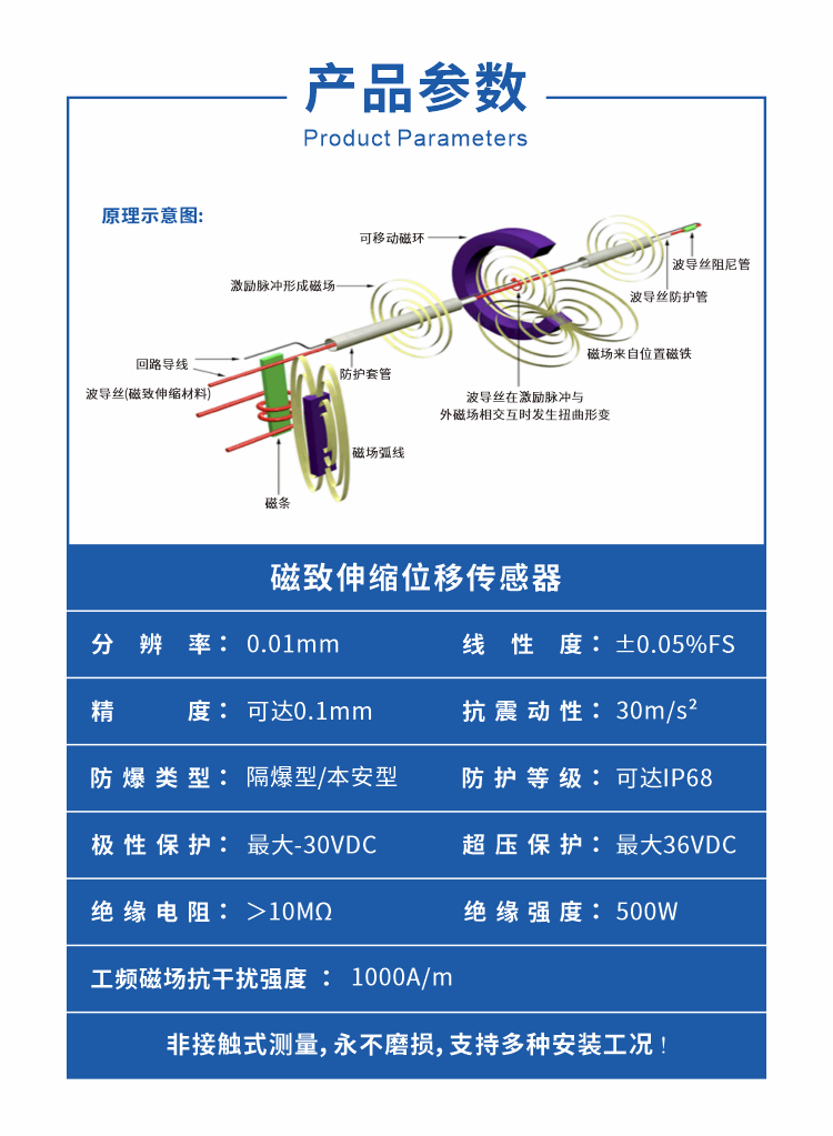 线性度:±0.05%FS,分辨率:0.01����� �������Ƴ������������ �������Ƴ������������ �������Ƴ������������ �������Ƴ�������mm,精度可达0.1mm,抗震动性����� �������Ƴ������������ �������Ƴ������������ �������Ƴ����������� �������Ƴ�������30m/s²,工频磁场抗干扰强度1000����� �������Ƴ����������� �������Ƴ������������ �������Ƴ������������ �������Ƴ�������A/m,防护等级可达IP68,非接触式测量,永����� �������Ƴ������������ �������Ƴ������������ �������Ƴ������������ �������Ƴ�������不磨损,支持多种安装工况!更多详����� �������Ƴ������������ �������Ƴ����������� �������Ƴ������������ �������Ƴ�������细资料,请联系我们!