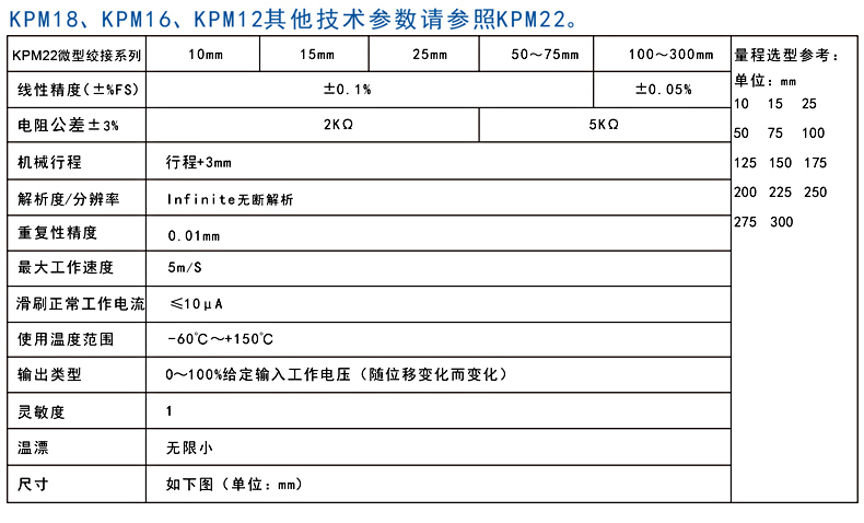 KPM12电位计(别名:裂缝计,裂缝位移传感器,电子尺����� �������Ƴ������������ �������Ƴ������������ �������Ƴ������������ �������Ƴ�������,电阻尺,电位器,位移传感器)原理:电位计原理,所有����� �������Ƴ������������ �������Ƴ������������ �������Ƴ������������ �������Ƴ�������传感器为位置测量型,用于调节系统(控制����� �������Ƴ����������� �������Ƴ������������ �������Ƴ������������ �������Ƴ�������系统)和测量系统中,对位移和长度进行����� �������Ƴ����������� �������Ƴ������������ �������Ƴ����������� �������Ƴ������直接测量,输出直流电压信号,也可����� �������Ƴ������������ �������Ƴ������������ �������Ƴ������������ �������Ƴ�������以通过内置或者外置的V/A变送模块将信号转换成标准的0-5V、0-10����� �������Ƴ������������ �������Ƴ������������ �������Ƴ������������ �������Ƴ�������V或者4-20mA直流信号,也可以远距离传输控����� �������Ƴ������������ �������Ƴ������������ �������Ƴ������������ �������Ƴ�������制要求。KPM12电位计(别名:裂缝计,����� �������Ƴ����������� �������Ƴ������������ �������Ƴ������������ �������Ƴ�������裂缝位移传感器,电子尺,电阻尺,电位器,位移传感����� �������Ƴ������������ �������Ƴ������������ �������Ƴ������������ �������Ƴ������器)输出位移变化:0-100%给定输入工作电压(����� �������Ƴ����������� �������Ƴ������������ �������Ƴ������������ �������Ƴ�������随位移变化而变化)。