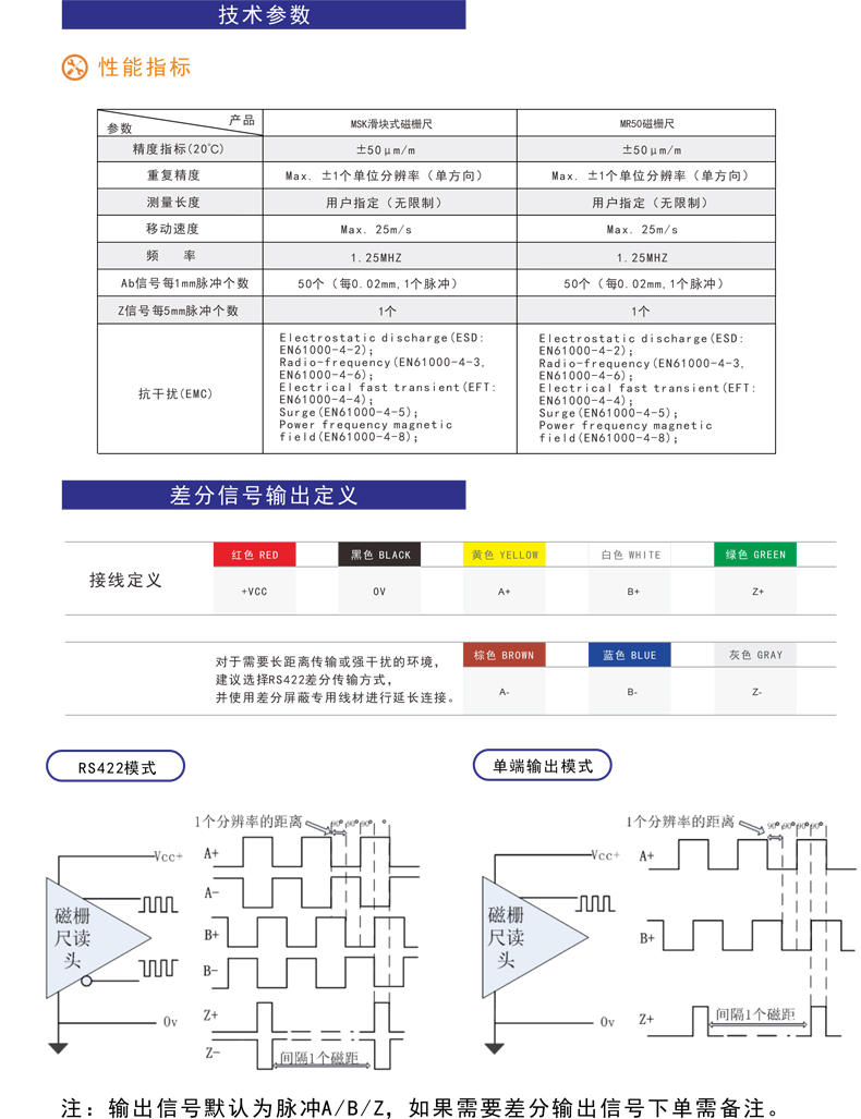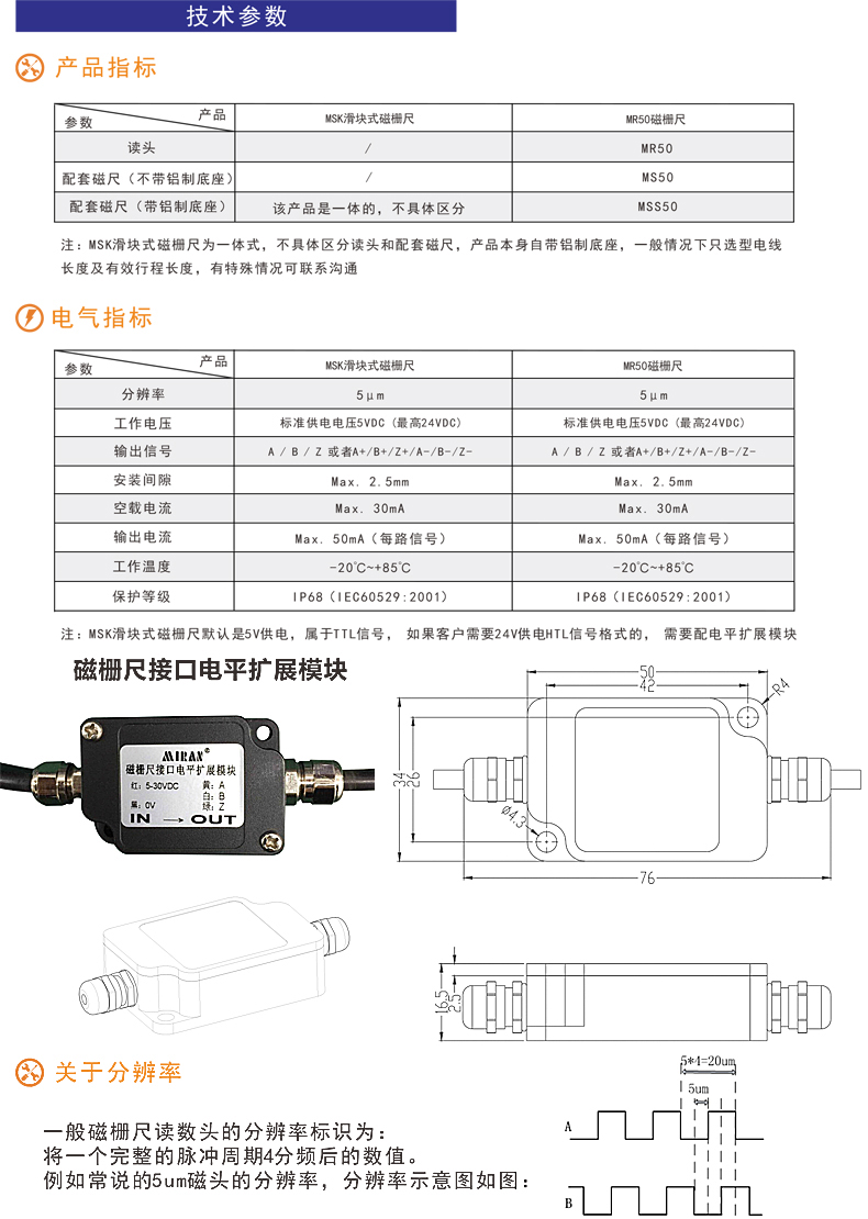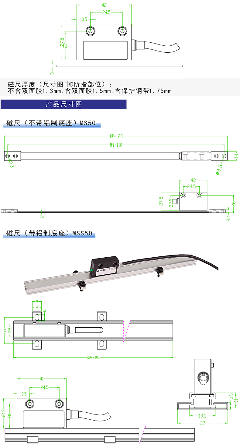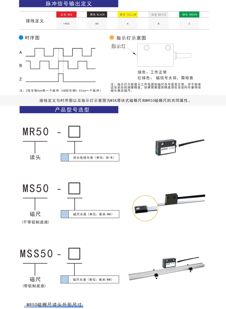 MR50磁栅尺是磁栅测量系统,其中MR是读磁头、MS是磁尺,它们之间根据磁感应的����� �������Ƴ������������ �������Ƴ����������� �������Ƴ������������ �������Ƴ������原理进行工作。当MR读磁头在MS磁尺的磁场空间中做直线运动时,读磁头会根����� �������Ƴ������������ �������Ƴ������������ �������Ƴ������������ �������Ƴ�������据运动的相关位移量实时的输出符合标准的位置脉����� �������Ƴ������������ �������Ƴ������������ �������Ƴ����������� �������Ƴ�������冲。 本产品主要用于木工、石材加工、锯切����� �������Ƴ������������ �������Ƴ������������ �������Ƴ������������ �������Ƴ�������、金属切削、纺织、印刷、包装、塑����� �������Ƴ������������ �������Ƴ������������ �������Ƴ������������ �������Ƴ�������料加工、自动化系统、切割设备、电子组����� �������Ƴ������������ �������Ƴ����������� �������Ƴ������������ �������Ƴ�������装设备、测量/检测设备等。MR50磁栅尺具有以下优点:非接触、高速测量����� �������Ƴ������������ �������Ƴ������������ �������Ƴ������������ �������Ƴ�������;高分辨率;内置LED状态指示灯;极强的抗污和抗����� �������Ƴ������������ �������Ƴ����������� �������Ƴ������������ �������Ƴ������油能力;简易的安装方式;