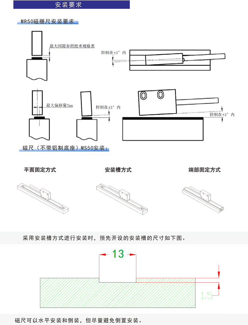 MR50磁栅尺分为磁条安装式和铝制底座安装����� �������Ƴ������������ �������Ƴ������������ �������Ƴ������������ �������Ƴ������式,适用于较大量程测量范围,可根据现场安装环����� �������Ƴ������������ �������Ƴ������������ �������Ƴ������������ �������Ƴ�������境选择。