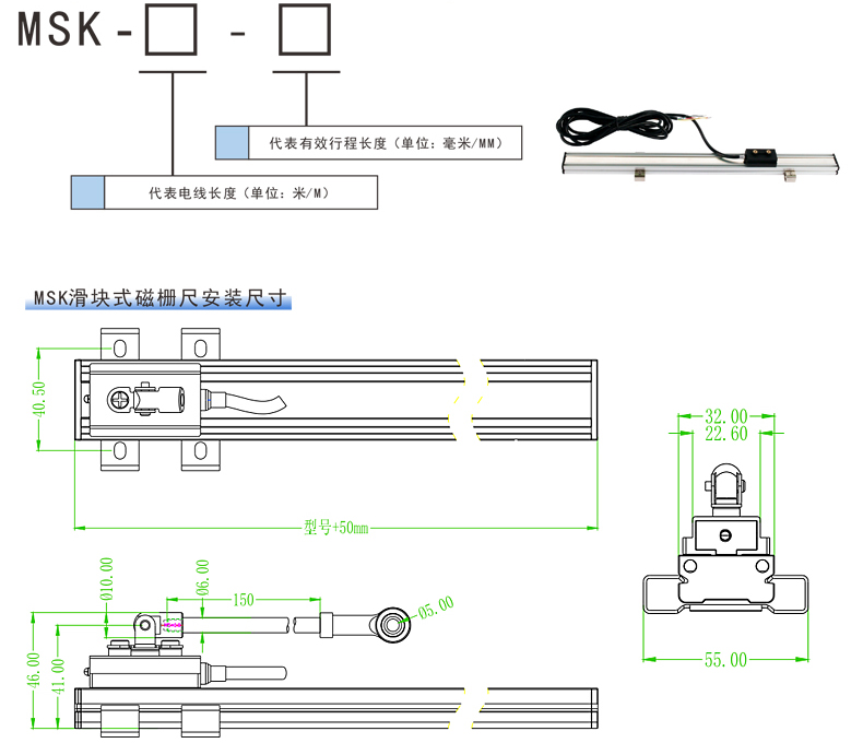 四、MSK滑块式磁栅尺选型及����� �������Ƴ������������ �������Ƴ������������ �������Ƴ������������ �������Ƴ�������安装尺寸:
