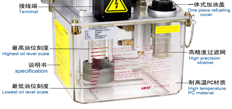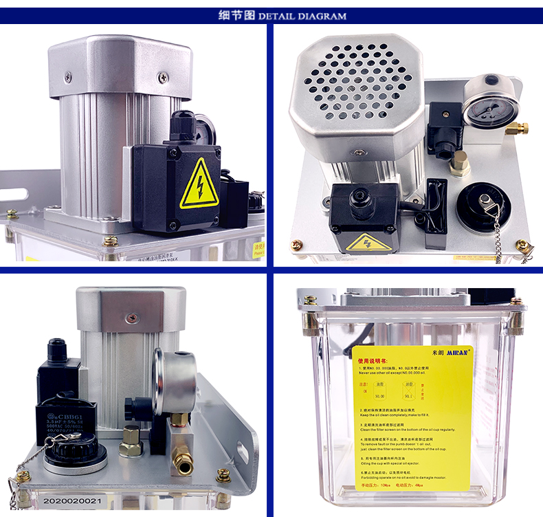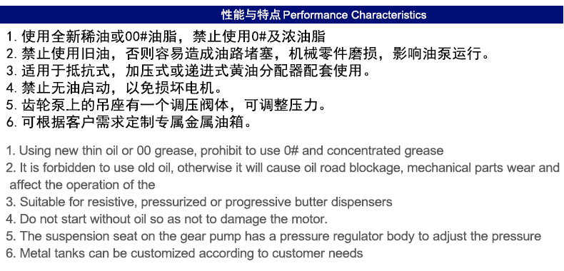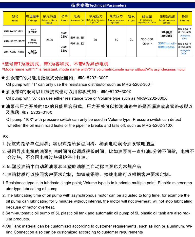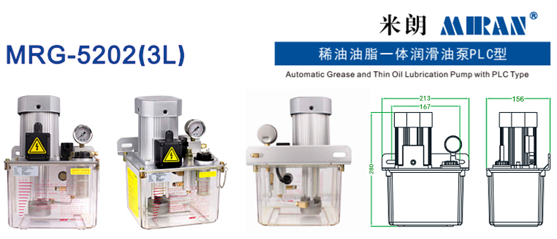 稀油油脂一体润滑油泵PLC型特点:流量300-500ml/min,额定注油压力20-50Kgf/cm,操作方式微电脑,电机电压220/380VAC,电机功率60/90W,润滑油粘度范围30#~00#,油箱容积3L,出油口管道Φ6mm,适用系统抵抗式/容积式。