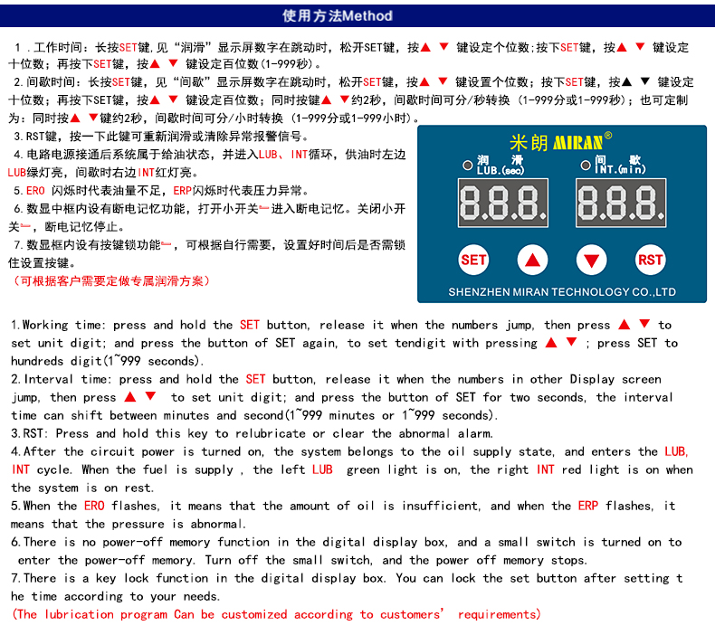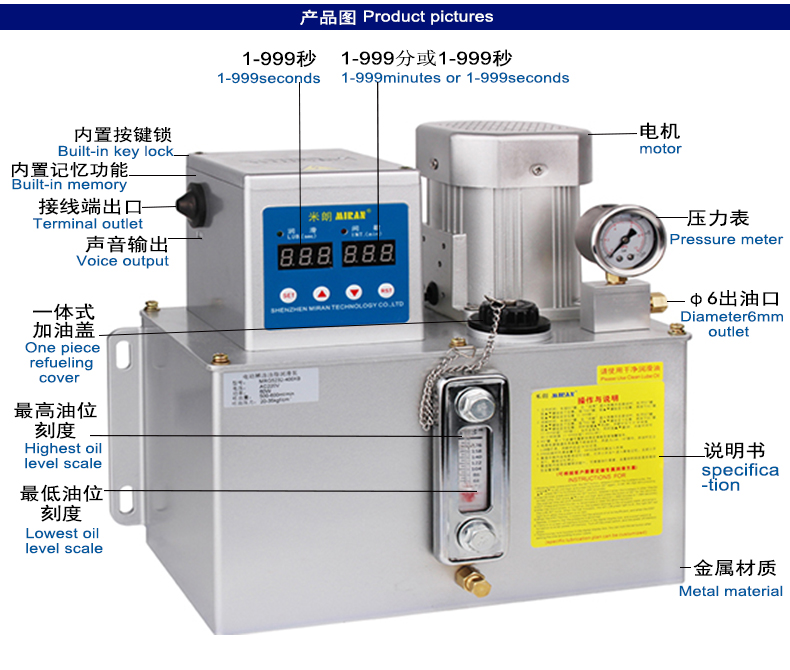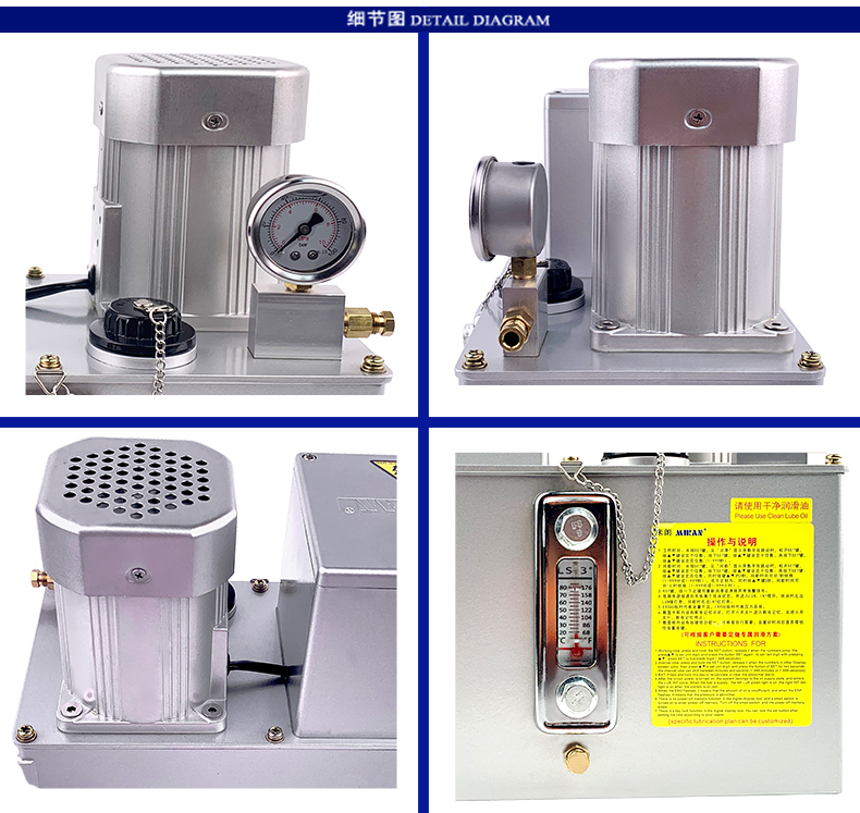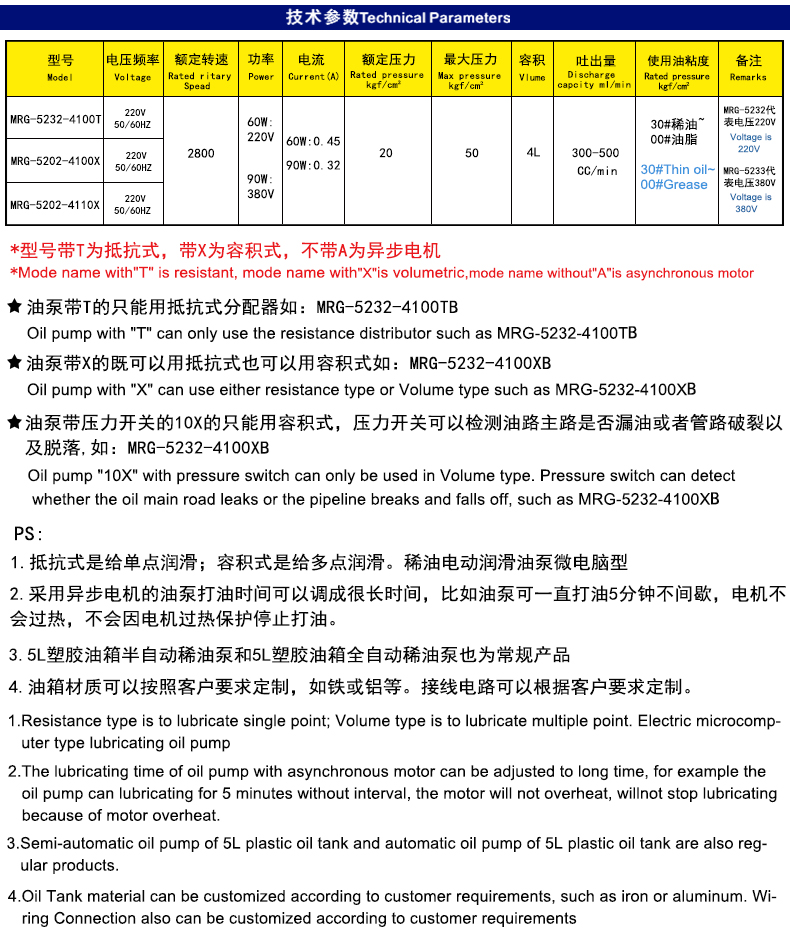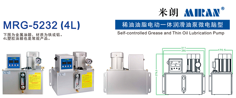 稀油油脂电动一体润滑油泵微电脑型特点:流量300-500ml/min,额定注油压力20-50Kgf/cm,操作方式微电脑,电机电压220/380VAC,电机功率60/90W,润滑油粘度范围30#~00#,油箱容积4L,出油口管道Φ6mm,适用系统抵抗式/容积式。