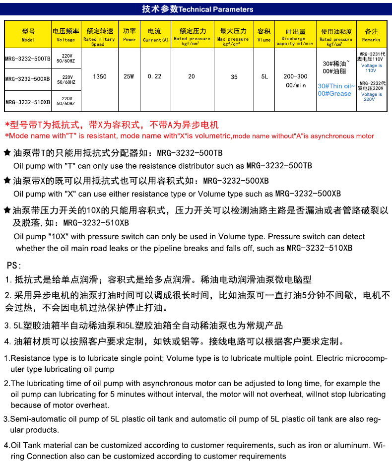 电动稀油油脂一体润滑油泵详细参数说明: