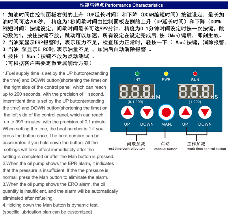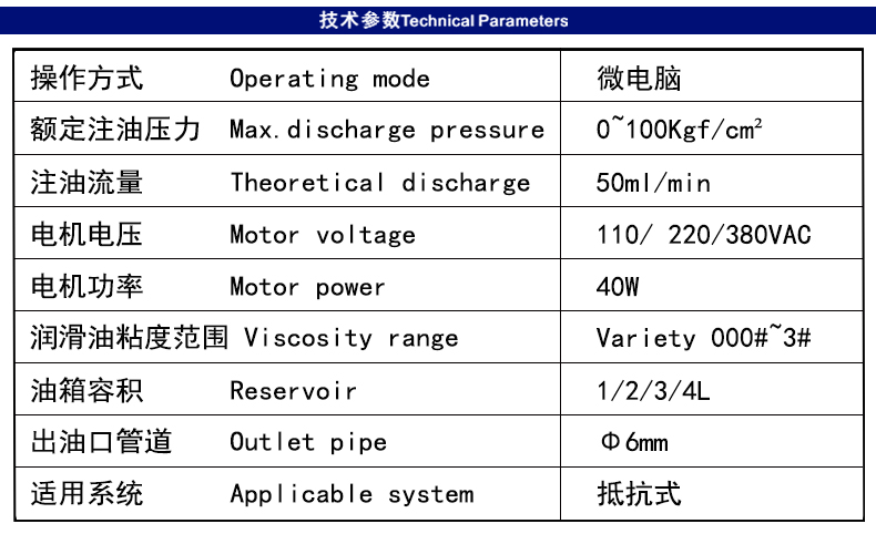 电动黄油泵技术特点:流量50ml/min,额定����� �������Ƴ������������ �������Ƴ������������ �������Ƴ������������ �������Ƴ�������注油压力0~100Kgf/cm,操作����� �������Ƴ������������ �������Ƴ������������ �������Ƴ������������ �������Ƴ�������方式微电脑,电机电压110/ 22����� �������Ƴ������������ �������Ƴ������������ �������Ƴ������������ �������Ƴ�������0/380VAC,电机功率40����� �������Ƴ������������ �������Ƴ������������ �������Ƴ������������ �������Ƴ�������W,润滑油粘度范围Variety 000#~����� �������Ƴ������������ �������Ƴ������������ �������Ƴ������������ �������Ƴ�������3#,油箱容积1/2/3/4L,出油口管道Φ6m����� �������Ƴ������������ �������Ƴ������������ �������Ƴ������������ �������Ƴ�������m,适用系统抵抗式。