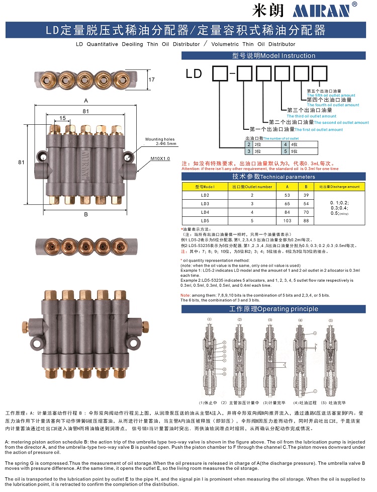 1:LD5-2表示为5位分配器,1, 2,3,4,5 出油口油量全部为0.2ml每次。