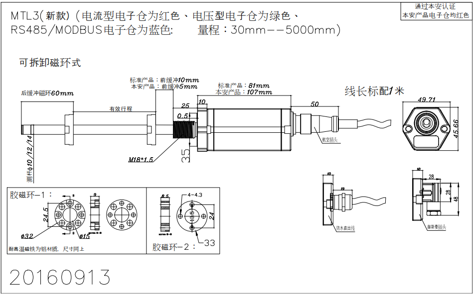 MTL3磁环式磁致伸缩位移传感器侧出线����� �������Ƴ������������ �������Ƴ������������ �������Ƴ������������ �������Ƴ�������尺寸图: