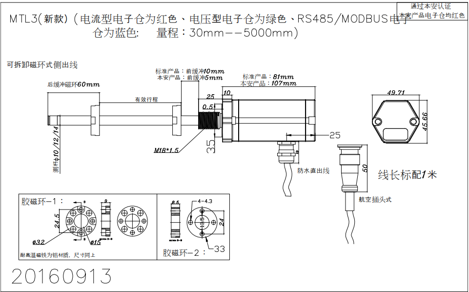 MTL3-EX磁环式磁致伸缩位移传感器����� �������Ƴ������������ �������Ƴ������������ �������Ƴ����������� �������Ƴ�������尺寸图: