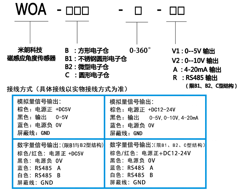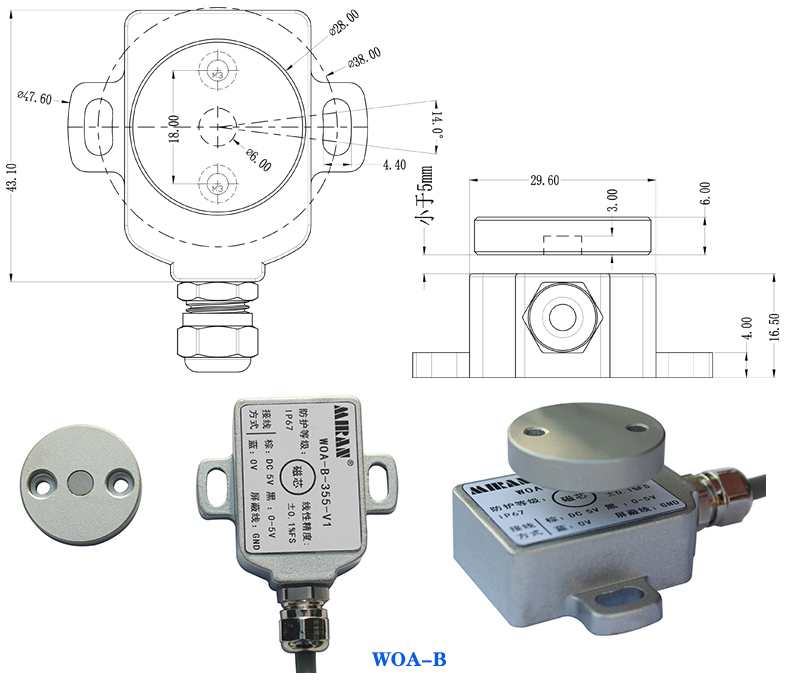 米朗科技WOA-B系列霍尔角度传感器,霍尔角度(磁感应分体式)位移传感器����� �������Ƴ������������ �������Ƴ������������ �������Ƴ������������ �������Ƴ�������采用磁电原理(内部非接触式)测量角度,具有无触点、长寿命、高分辨����� �������Ƴ������������ �������Ƴ������������ �������Ƴ������������ �������Ƴ������、高频响、低温漂、优线性、防水、防尘、耐振抗冲����� �������Ƴ������������ �������Ƴ������������ �������Ƴ������������ �������Ƴ������、抗干扰等特点。广泛应用于����� �������Ƴ������������ �������Ƴ������������ �������Ƴ������������ �������Ƴ�������水、油、气、振动、冲击等多种����� �������Ƴ������������ �������Ƴ����������� �������Ƴ������������ �������Ƴ������恶劣工业环境中。