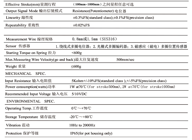 WEP-S拉线位移传感器的参数资料: