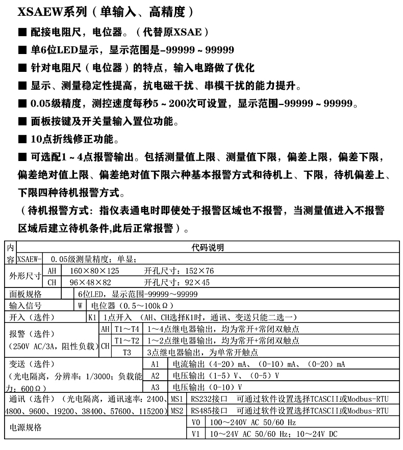 配接电阻尺,电位器。(代替原XS����� �������Ƴ����������� �������Ƴ������������ �������Ƴ������������ �������Ƴ�������AE)。单6位LED显示,显示范����� �������Ƴ������������ �������Ƴ����������� �������Ƴ����������� �������Ƴ�������围是-99999~99999。针对电阻����� �������Ƴ����������� �������Ƴ������������ �������Ƴ������������ �������Ƴ�������尺(电位器)的特点,输入电路做了����� �������Ƴ����������� �������Ƴ����������� �������Ƴ������������ �������Ƴ�������优化。显示、测量稳定性提高,抗电磁干扰、����� �������Ƴ������������ �������Ƴ������������ �������Ƴ������������ �������Ƴ�������串模干扰的能力提升。0.05级����� �������Ƴ������������ �������Ƴ������������ �������Ƴ������������ �������Ƴ�������精度,测控速度每秒5~200����� �������Ƴ������������ �������Ƴ������������ �������Ƴ����������� �������Ƴ�������次可设置,显示范围-99999~9999����� �������Ƴ������������ �������Ƴ������������ �������Ƴ������������ �������Ƴ�������9。面板按键及开关量输入置位功能。10点����� �������Ƴ����������� �������Ƴ����������� �������Ƴ����������� �������Ƴ�������折线修正功能。可选配1~����� �������Ƴ����������� �������Ƴ������������ �������Ƴ������������ �������Ƴ�������4点报警输出。六种基本报警方式和待机上、����� �������Ƴ������������ �������Ƴ������������ �������Ƴ������������ �������Ƴ�������下限,待机偏差上、下限四种����� �������Ƴ������������ �������Ƴ������������ �������Ƴ������������ �������Ƴ�������待机报警方式。(待机报警方式:指仪表通电时即����� �������Ƴ������������ �������Ƴ������������ �������Ƴ����������� �������Ƴ�������使处于报警区域也不报警,当测量值进入不报警����� �������Ƴ������������ �������Ƴ������������ �������Ƴ������������ �������Ƴ�������区域后建立待机条件,此后正常报警)。