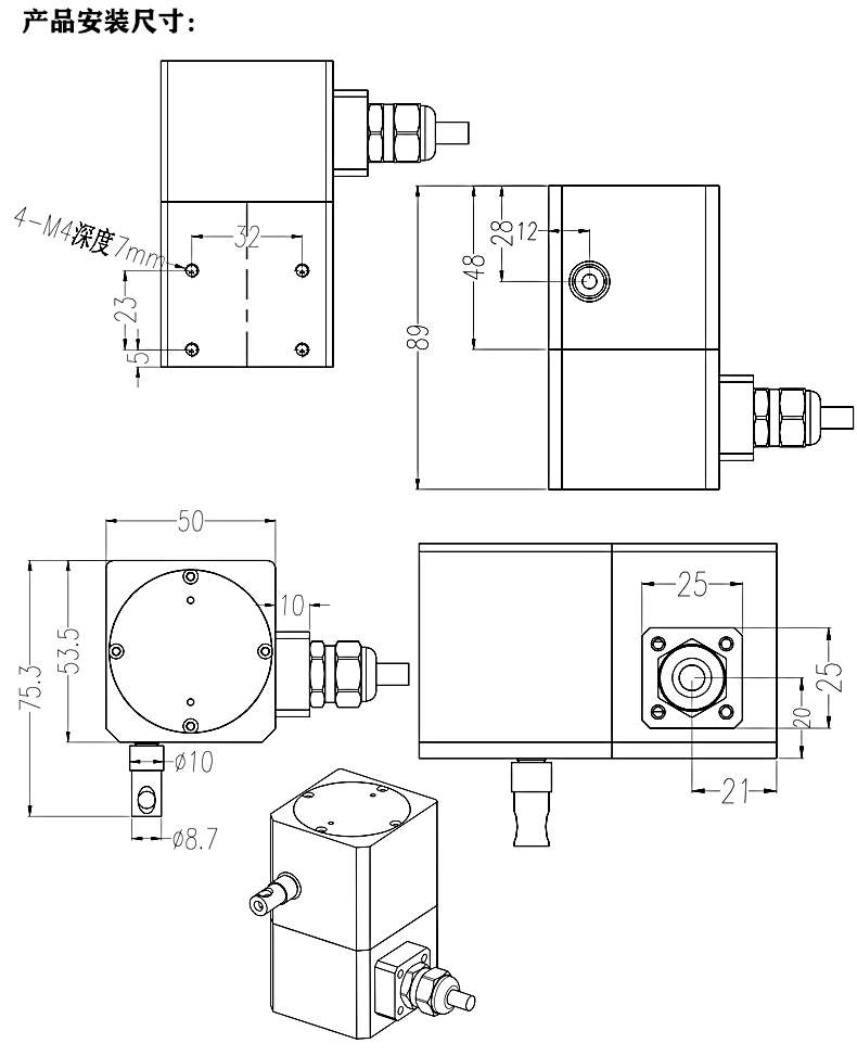 1,利用底部4个固定螺丝孔,依现场及机器安装空间设施需要,直接安装或另加保护或其他机械使用。