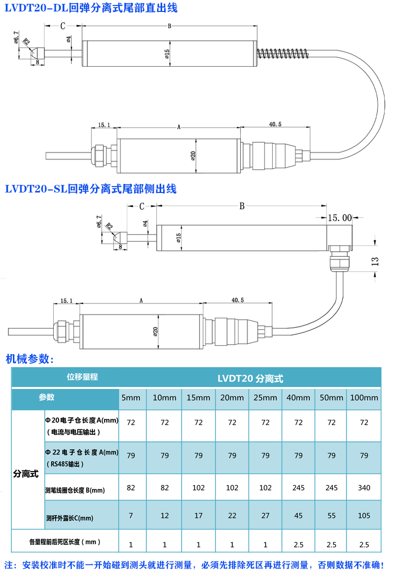 LVDT20回弹分离式位移传感器技术参数: