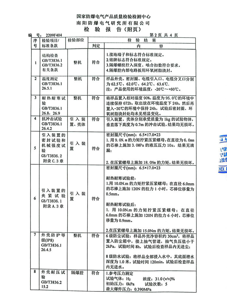 经对上述产品图样及技术文件的审查和样品检验����� �������Ƴ������������ �������Ƴ������������ �������Ƴ������������ �������Ƴ������,确认符合下列标准:GB/T3836.1- 2����� �������Ƴ������������ �������Ƴ������������ �������Ƴ������������ �������Ƴ�������021《爆炸性环境第1部分:设备通用要求》,GB����� �������Ƴ������������ �������Ƴ������������ �������Ƴ������������ �������Ƴ�������/T38����� �������Ƴ�������� �������Ƴ������������ �������Ƴ������������ �������Ƴ������������ �������Ƴ�����������36.2- -2021《爆����� �������Ƴ������������ �������Ƴ������������ �������Ƴ������������ �������Ƴ������炸性环境 第2部分:由隔爆外壳"d"保护����� �������Ƴ������������ �������Ƴ������������ �������Ƴ������������ �������Ƴ�������的设备》。 1.使用环境温度: -����� �������Ƴ������������ �������Ƴ����������� �������Ƴ������������ �������Ƴ�������20℃~+60℃,2.外壳防����� �������Ƴ������������ �������Ƴ����������� �������Ƴ����������� �������Ƴ�������护等级: IP68(1m/2h)。