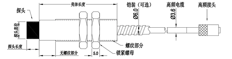 在制作过程中,探头头部体一般采用耐高����� �������Ƴ������������ �������Ƴ������������ �������Ƴ������������ �������Ƴ�������温PPS工程塑料,通过“二次注塑”成型将线����� �������Ƴ������������ �������Ƴ������������ �������Ƴ����������� �������Ƴ�������圈密封其中。使探头在恶劣的环境中能����� �������Ƴ������������ �������Ƴ������������ �������Ƴ������������ �������Ƴ�������可靠工作。由于头部体线圈直径决定传感����� �������Ƴ������������ �������Ƴ������������ �������Ƴ����������� �������Ƴ�������器系统的线性量程,因此我����� �������Ƴ������������ �������Ƴ������������ �������Ƴ������������ �������Ƴ�������们通常用头部体外部直径来分����� �������Ƴ������������ �������Ƴ������������ �������Ƴ������������ �������Ƴ�������类和表征各型号探头,一般情况下����� �������Ƴ����������� �������Ƴ������������ �������Ƴ������������ �������Ƴ������传感器系统的线性量程大致是探����� �������Ƴ������������ �������Ƴ������������ �������Ƴ������������ �������Ƴ������头头部直径的1/21/4倍。ML33系列传感器探头见图所示(标准型):