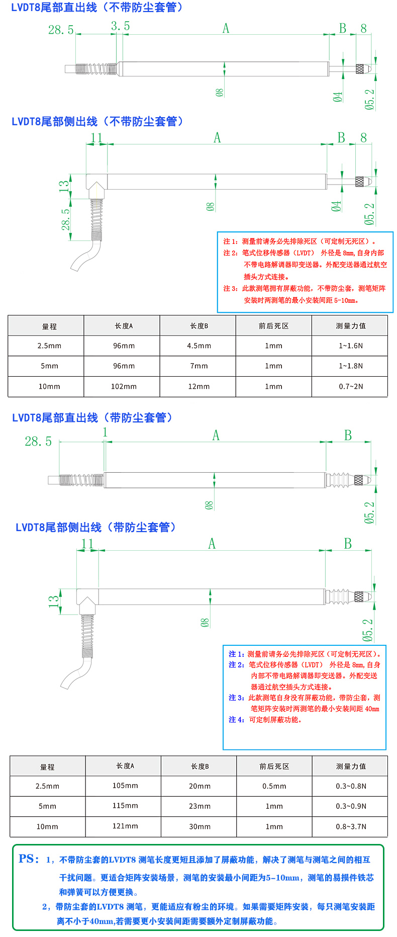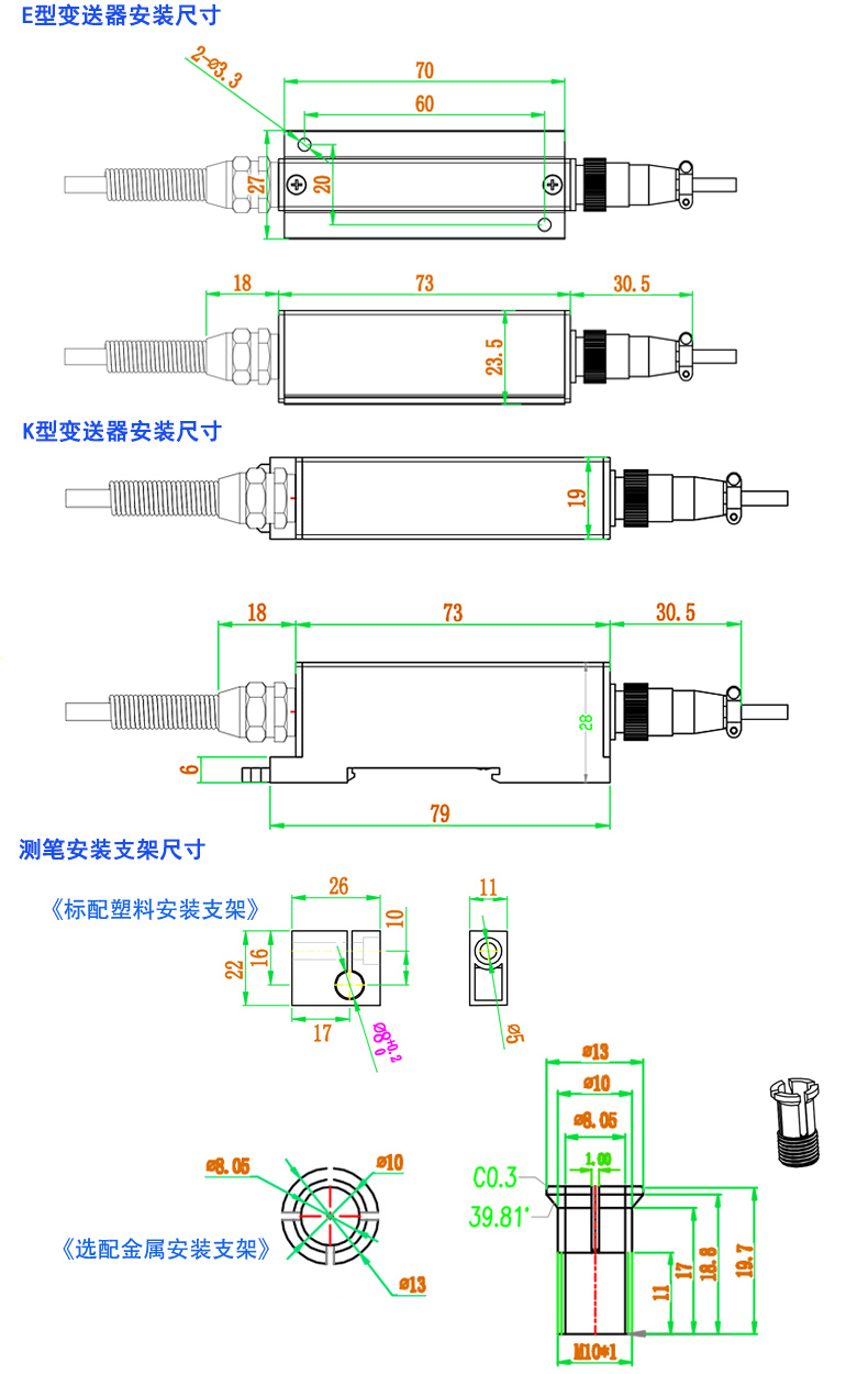 1.外径Φ8mm笔形回弹式位移传感器,