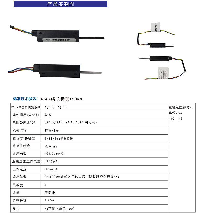 KS8X微型自复位式位移传感����� �������Ƴ������������ �������Ƴ������������ �������Ƴ������������ �������Ƴ�������器(别名:电子尺,电阻尺,电位器,直线位移传感器)原理:电位计原理,所有传感器为位置测量����� �������Ƴ������������ �������Ƴ������������ �������Ƴ������������ �������Ƴ�������型,用于调节系统(控制系统)和����� �������Ƴ����������� �������Ƴ����������� �������Ƴ������������ �������Ƴ������测量系统中,对位移和长度进行直接测量,输出����� �������Ƴ����������� �������Ƴ������������ �������Ƴ������������ �������Ƴ�������直流电压信号,也可以通过内置或者外置的V/A变送����� �������Ƴ������������ �������Ƴ������������ �������Ƴ������������ �������Ƴ�������模块将信号转换成标准的0-5V、0-10V或者����� �������Ƴ����������� �������Ƴ������������ �������Ƴ������������ �������Ƴ�������4-20mA直流信号,也可以远距离传输控制要����� �������Ƴ������������ �������Ƴ������������ �������Ƴ������������ �������Ƴ�������求。KS8X微型自复位式位����� �������Ƴ������������ �������Ƴ������������ �������Ƴ������������ �������Ƴ�������移传感器(别名:电子尺,����� �������Ƴ������������ �������Ƴ������������ �������Ƴ������������ �������Ƴ������电阻尺,电位器,直线位移传感����� �������Ƴ����������� �������Ƴ������������ �������Ƴ������������ �������Ƴ�������器)输出位移变化:0-100%给定输入工作电压(����� �������Ƴ����������� �������Ƴ������������ �������Ƴ������������ �������Ƴ�������随位移变化而变化)。